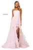 Glitter organza A-line gown with flower appliques featuring a sheer full length A-line skirt with ruffled slit and cocktail length under lining, and strapless neckline.