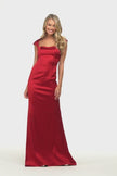 Fitted satin gown with straight neckline, cap sleeves, back cut out, and lower back ruching.