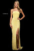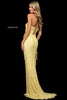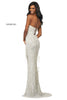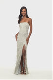 Fitted beaded gown with strapless neckline, corset style lace up back, skirt slit, and beaded fringe on skirt.