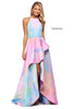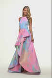 Tie-dye print mikado A-line dress with ruffled skirt slit and high cut halter style neckline with back cut out.
