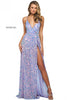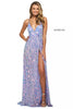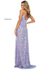 Paillette and sequin gown with deep V neckline wrap bodice and high skirt slit.