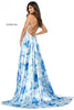 French floral pattern satin A-line gown with open lace up back and skirt slit.