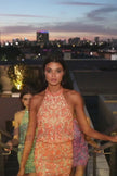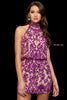 Pattern beaded cocktail dress with blouson bodice and high cut halter neckline with open back.