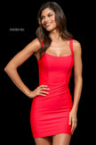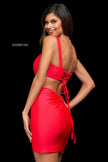 Silky stretch jersey fitted cocktail dress with rounded neckline, back cut out, lace up back, and ruched lower back.