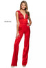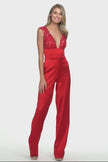 Satin jumpsuit with an empire waist lace bodice with plunging neckline, open lace up back, and ruched lower back.