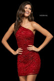 Star beaded and sequin fitted cocktail dress with one shoulder neckline.