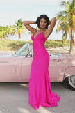 Fitted rhinestone jersey gown with a V-Neckline and a lace up back.