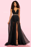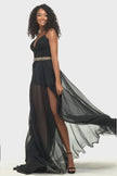 A-line hot fix scuba romper with deep V-Neckline, sheer overskirt, and beaded belt.