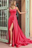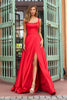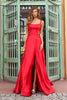 Satin straight neckline gown with strappy lace up back, and skirt slit.