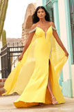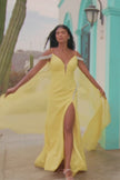 Fitted scuba gown, with a deep V-neckline illusion, beaded drapping sleeves, high skirt slit and chiffon cape.