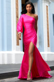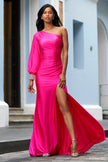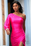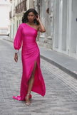 Fitted ruched jersey gown with one shoulder bishop sleeve, embellished cuff and a high slit.