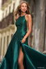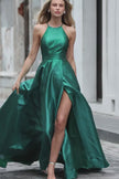 High neckline rhinestone mikado ball gown with high skirt slit.