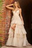 Tulle ball gown with tiered ruffle skirt, ruched bodice, and deep V neckline.