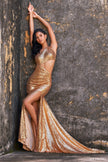 One shoulder sequin gown with open back and skirt slit.
