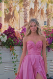 Taffeta A-line gown with a sweetheart neckline, ruched bodice and a skirt slit.