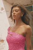 Fitted one shoulder sequin dress with high slit and straps across arm to the back.