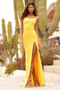 Long fitted scuba gown with hot fix stones, lace up back and high slit skirt.