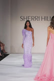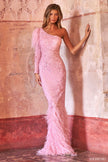 One shoulder long sleeve beaded gown with ostrich feathers on shoulder and bottom of skirt.