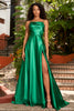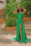 Silk charmeuse gown with cowl neckline and high slit.