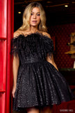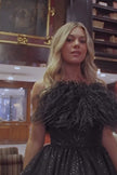 Sequin chiffon A-Line cocktail dress with strapless ostrich feather neckline.