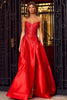 Strapless mikado ball gown with hot fix and high slit skirt.
