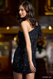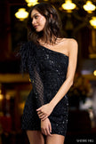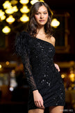 One shoulder long sleeve beaded cocktail dress with ostrich feathers on shoulder.