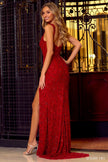 Long fully beaded lace gown with off the shoulder sleeves and high slit skirt.