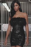 Strapless sequin cocktail gown with feathered top.