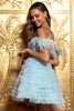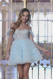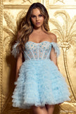 Lace corset bodice with off the shoulder ostrich feathers ruffle cocktail dress.