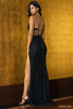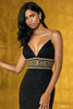Beaded gown with gold artwork on waistline, high slit and lace up back.