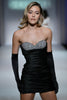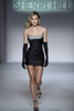 Strapless fitted cocktail dress with pearl embellishments on neckline. Gloves are not included.