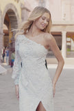 Leaf lace one shoulder gown with beaded embellishments on the sleeve.