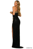 One shoulder fully beaded gown with fringe cap sleeve and fringe high slit skirt.