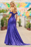 Machine sequin gown with corset bodice, detachable off the shoulder sleeves, and high slit.