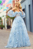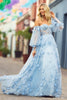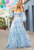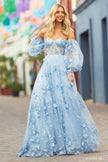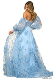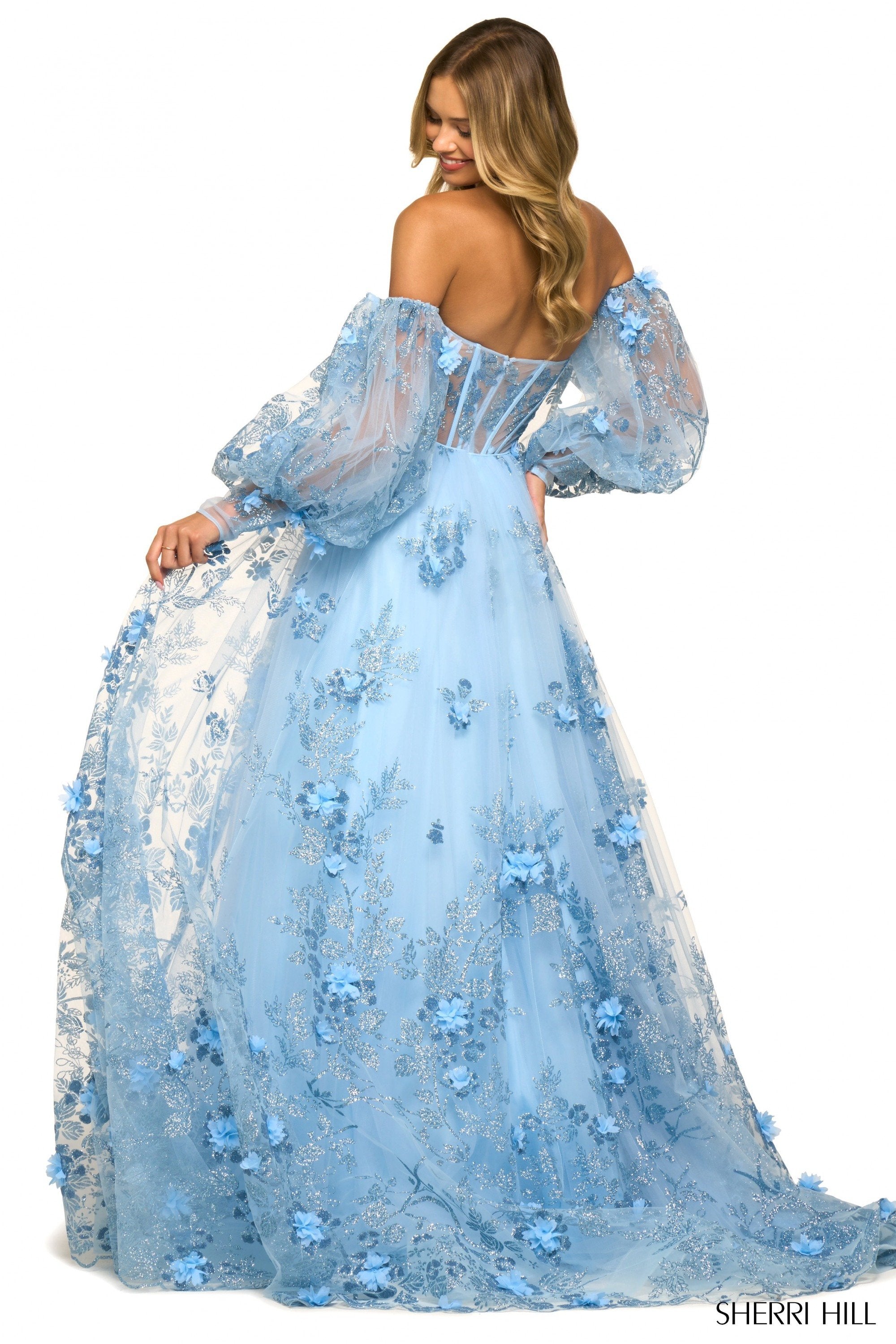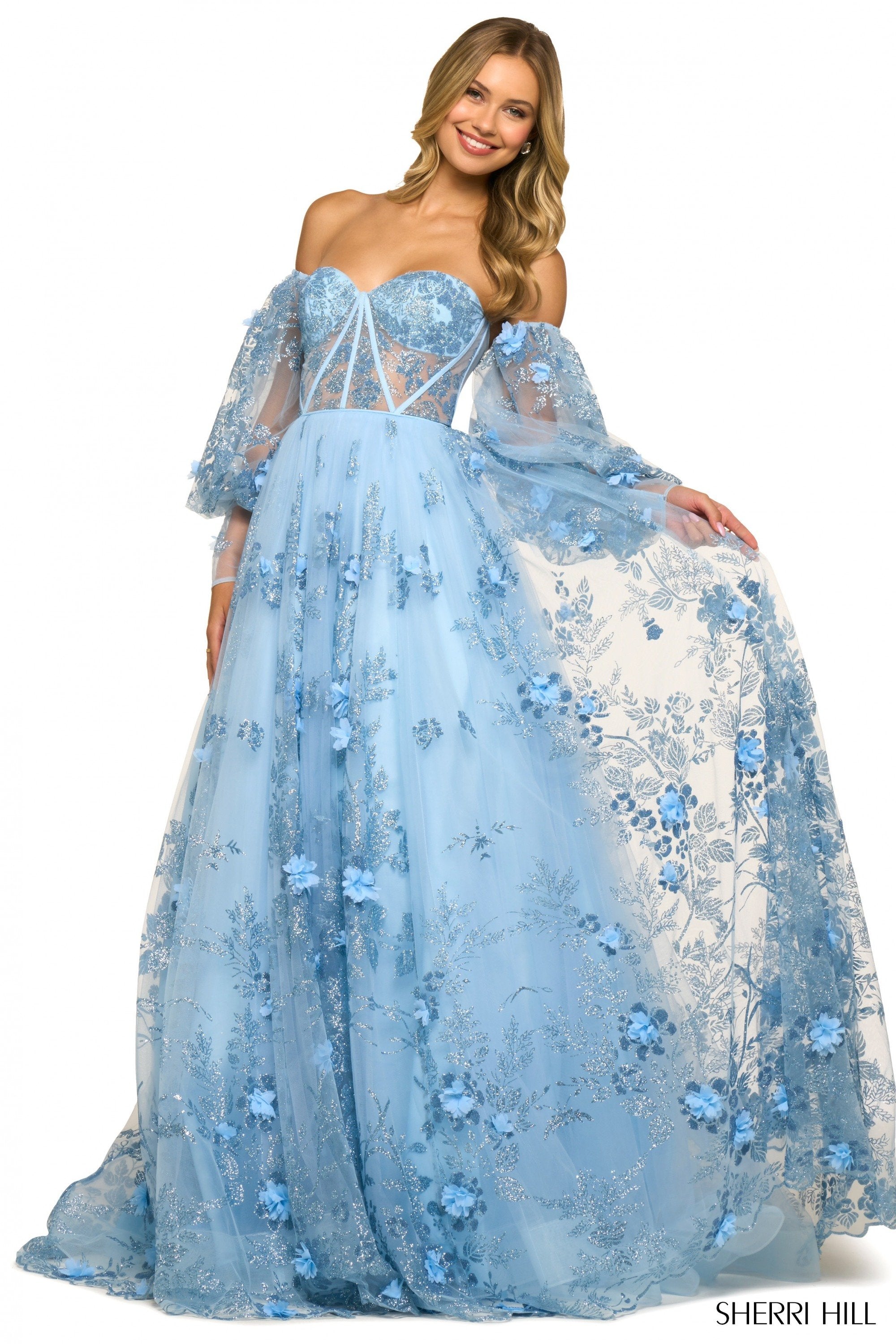 Strapless tulle ballgown with 3D flower embellishments, corset top, and removable sleeves.