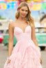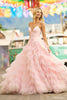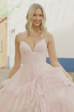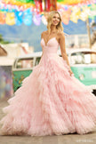 Ruffle tulle ballgown with spaghetti straps.