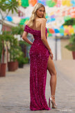 One shoulder velvet sequin gown with high side slit and off the shoulder sleeve.