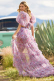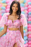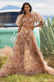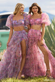 Tulle floral print two-piece gown with ballon sleeves, bodysuit ruffle skirt with high slit.