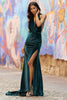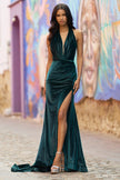 Halter velvet gown with an open back and high skirt slit.