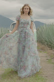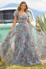 Tulle floral print gown with a bead embellished bodice, ruffle embellishments on skirt, and cap sleeves.