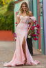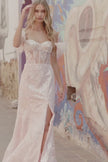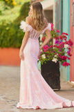 Fitted lace gown with off the shoulder feathered sleeves and lace corset bodice with sequin embellishments.