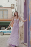 Fitted sheer corset lace and sequin mermaid gown with spaghetti straps.