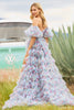 Tulle floral print gown with sheer corset bodice, ballon sleeves, ruffle embellishments and high skirt slit.
