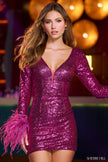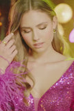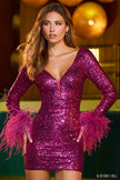 Sequin long sleeve cocktail dress with feathers around wrist.