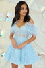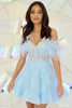Lace cocktail dress with sheer corset bodice, sweetheart neckline, and removable feathered sleeves.