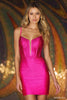 Fitted hot fix dress with corset bodice and plunging deep V illusion neckline.