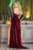 Strapless velvet corset gown with ruched bodice, high slit and side overskirt.