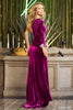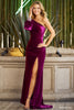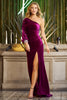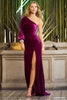 Fitted ruched velvet gown with one shoulder bishop sleeve, embellished cuff and a high slit.