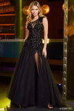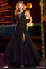 One shoulder 3D flower mermaid tulle gown with sequin skirt slit.