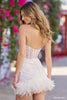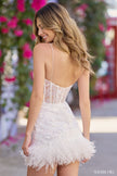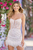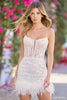 Sequin lace cocktail dress with sheer corset bodice and feathers on skirt hem.